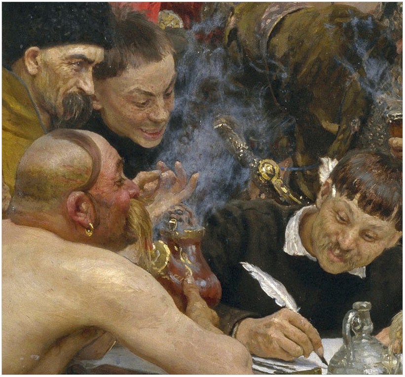 На картині Іллі Рєпіна “Запорожці” за спиною писаря, ліворуч ми бачимо типове обличчя бурсака.